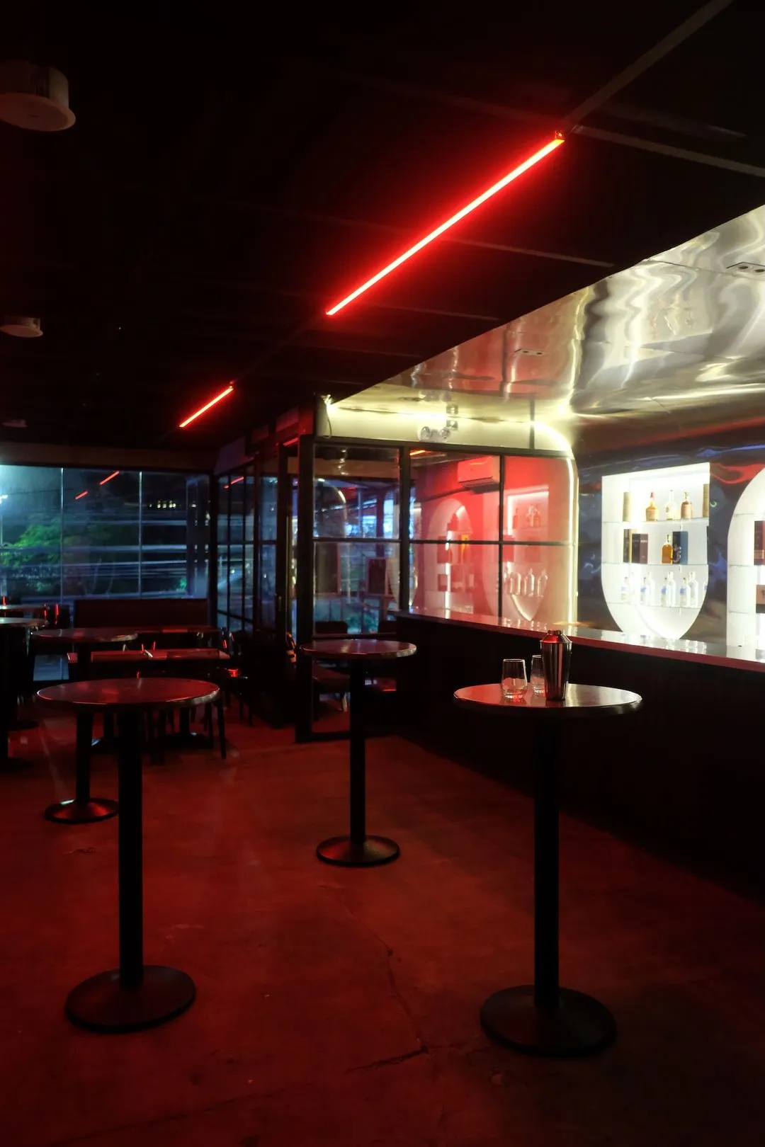 We were presented with an existing 100 sqm space that was envisioned to become a new homebase to a returning post-pandemic crowd in the heart of Katipunan. The main goal of the design was to create something unique yet simple, and to be able to construct it within a budget and short timeframe. Elements from the old space were incorporated in the design of the bar to reduce construction costs. The black box, one of the main design features, was a glass enclosure that was left in the space and repurposed to become the private lounge in the bar. A swooping curved wall houses the main bar, and is the focal point of the space. It is cladded with stainless steel and linear lights on the edges to accentuate its curves. Storage was designed into inverted arches that evoke a sense of movement drawing the eyes across the space with a sense of gentle undisturbed motion. Three arches in perfect balance with one another.