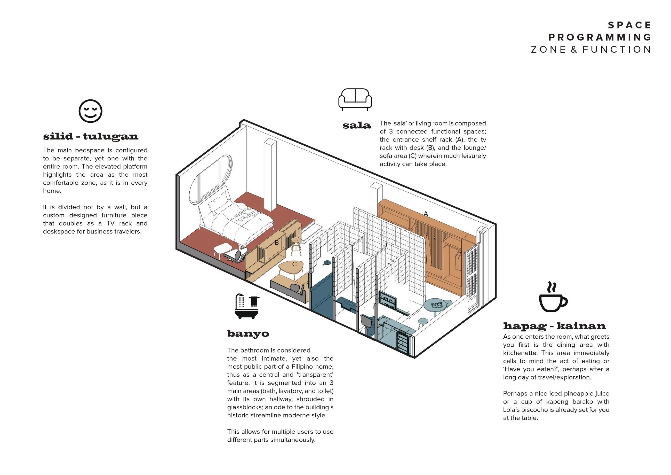 Uniquely typical, the absence of closed spaces allows for each room to maximize its flexibility in circulation for the natural progression of zones within the plan of each apartment unit. Bespoke locally-made furniture shall highlight not only the beauty of Filipino craftsmanship, but also create a dedicated space for multiple activities and touchpoints to the history of the building and the City of Manila.