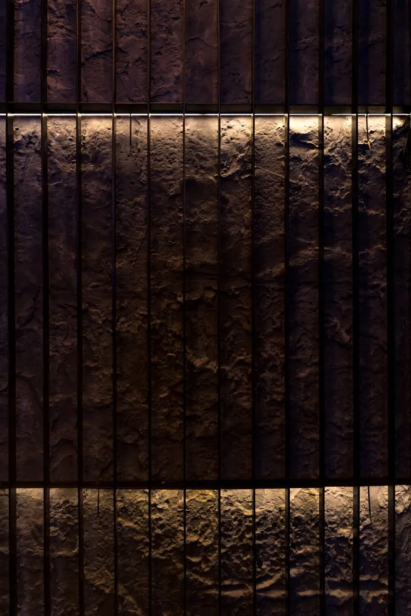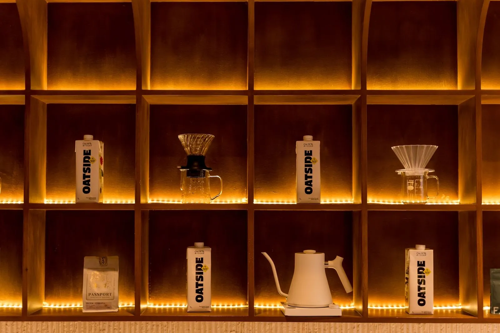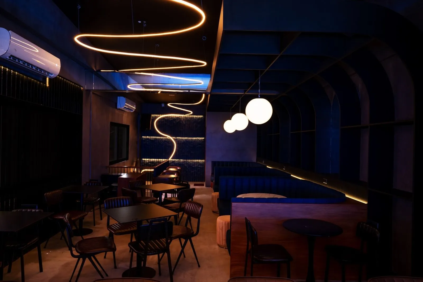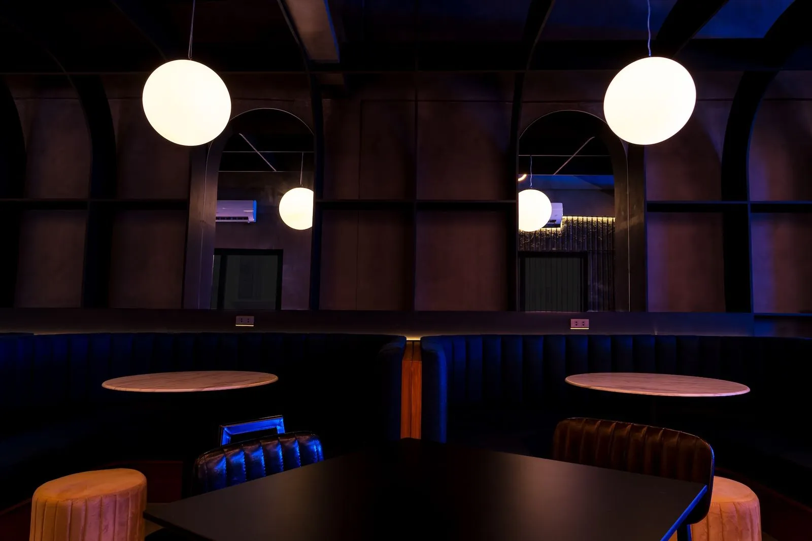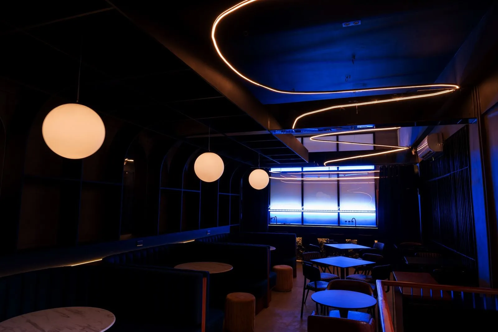 Through a disguised entrance at the back of the cafe, customers can gain access to a speakeasy on the second floor. This space was designed to complement the cafe while still remaining distinct and unique. Replicating the architectural language through the use of curves and textures, the speakeasy stands out through its clever use of lighting to highlight its high ceilings. With a snaking light that guides the user's eyes towards the bar, bathed in blue, the darker tones and metropolitan finishes set the mood for an otherworldly evening.