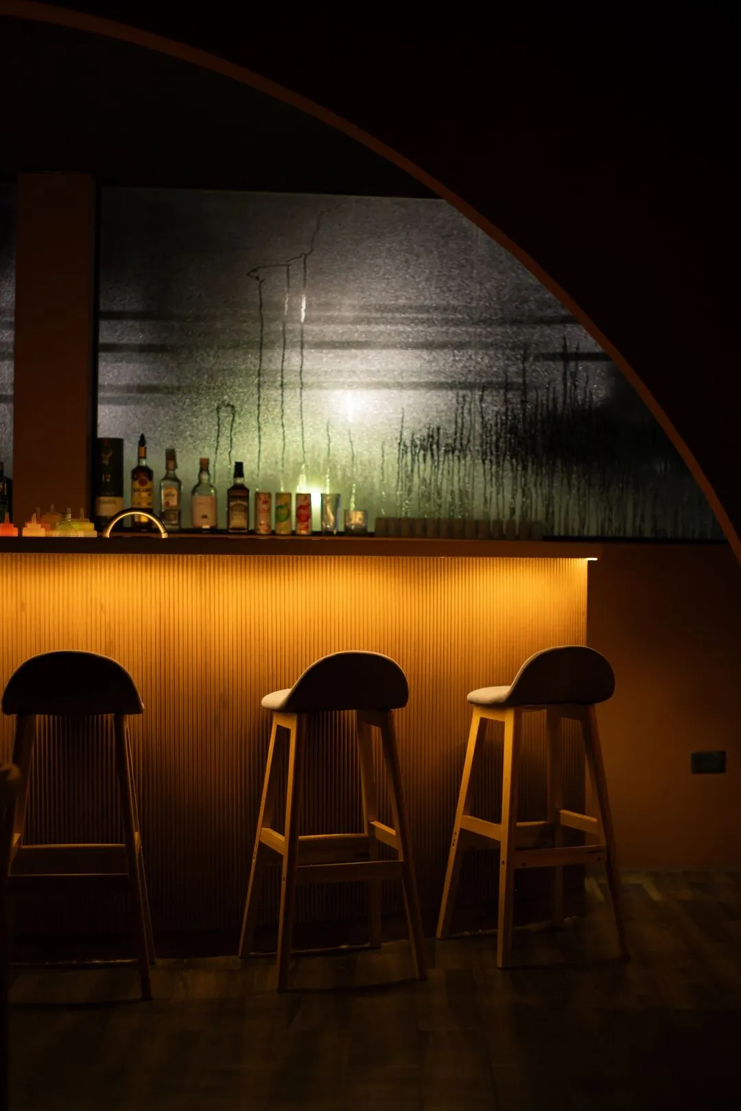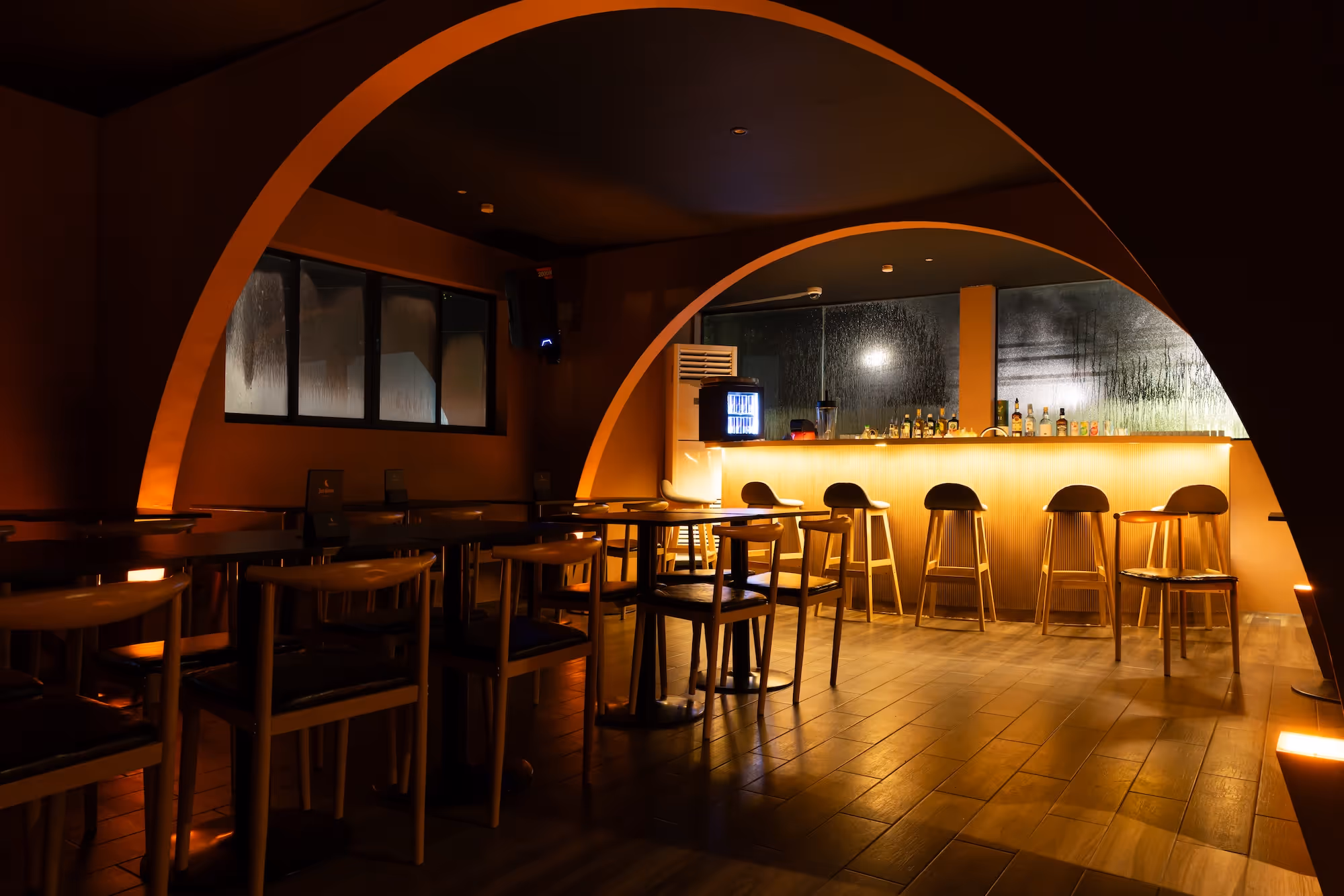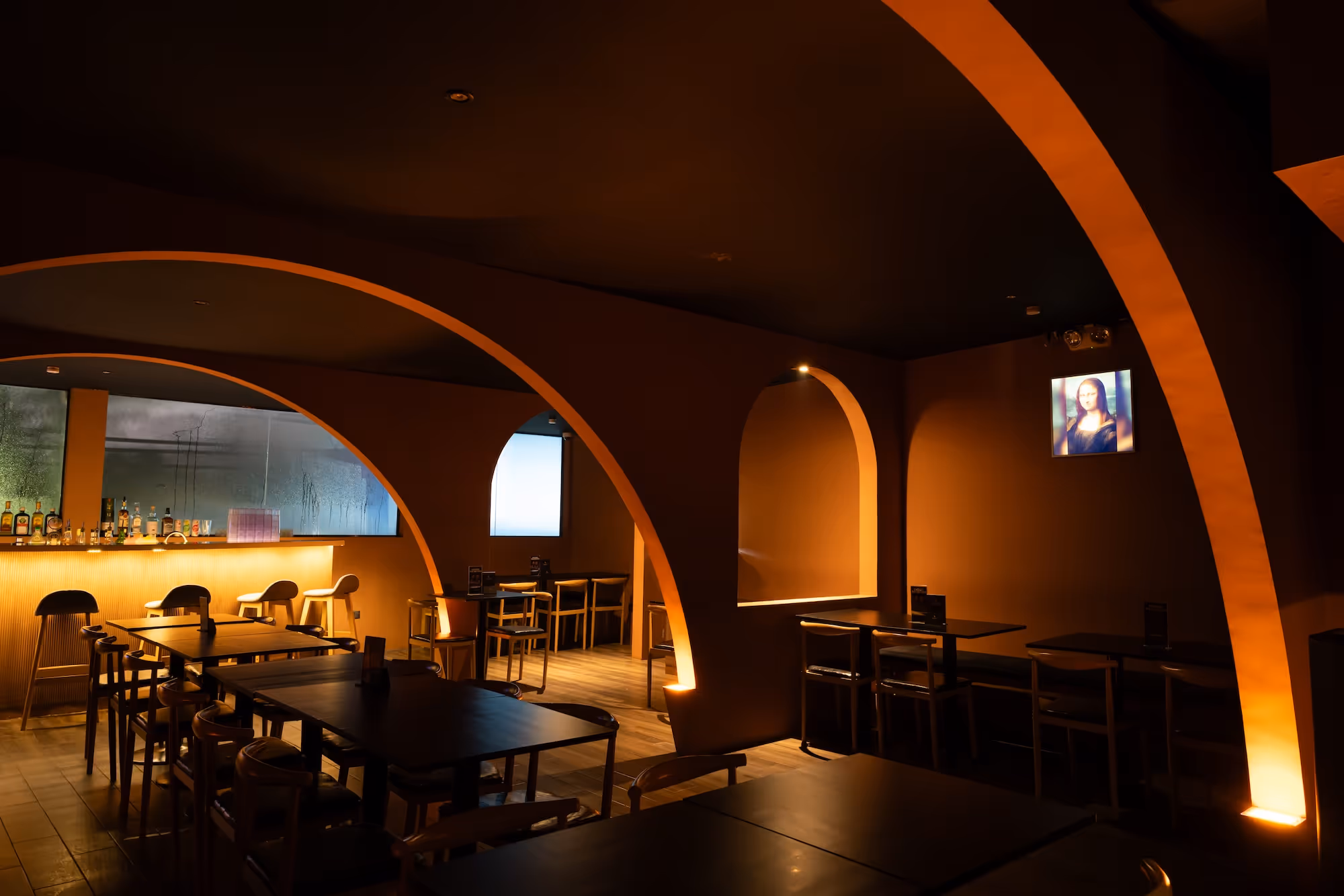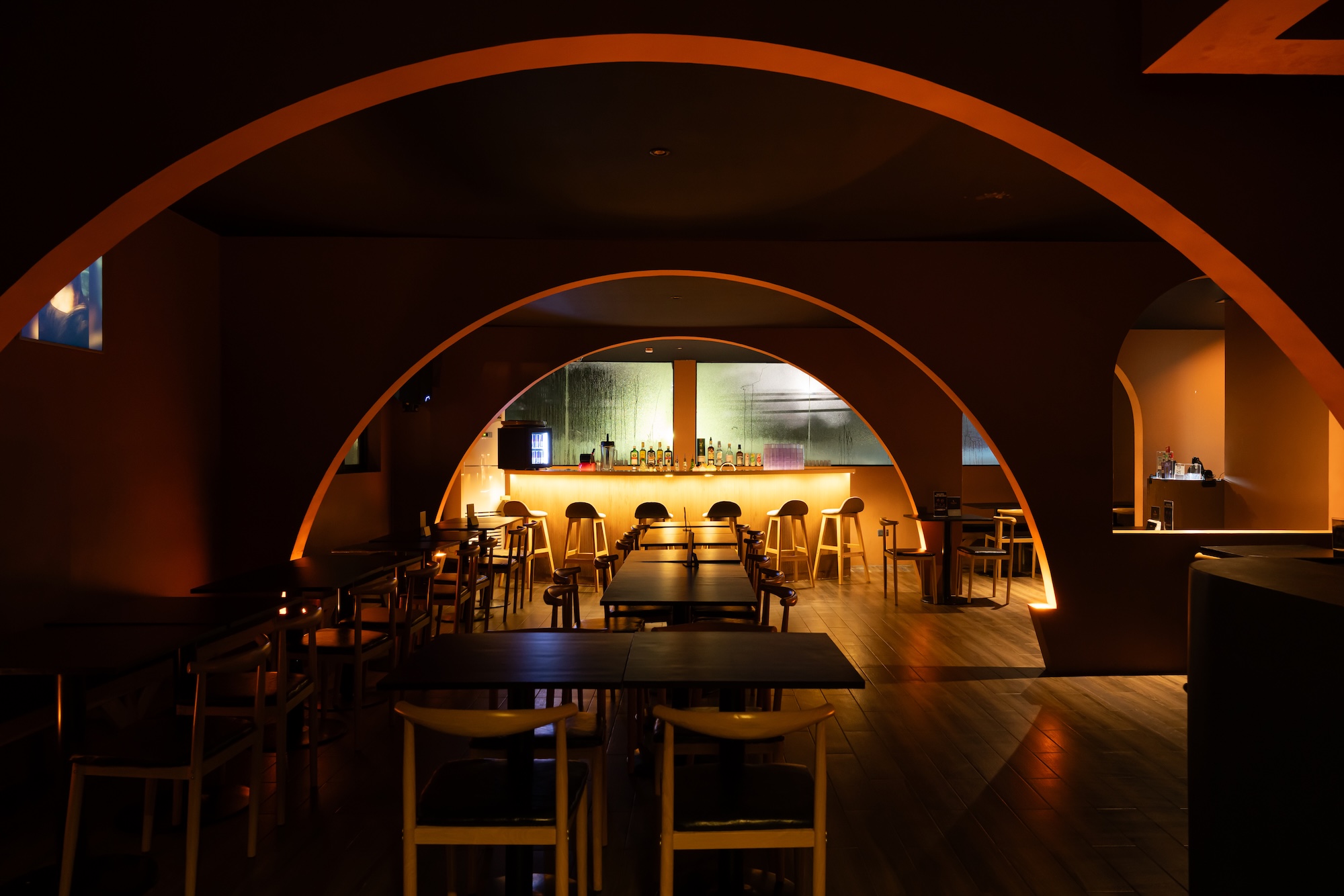 Upon viewing the space with its low ceilings, we knew that a more intimate design was called for. The space is situated above the existing Blackbox Bar, which features cool steel and dark finishes. To contrast this, a warm tone embraces the space, and arches swoop the ceiling to lead the viewer’s eye to the main bar counter and picture window. As the user ascends from the bar below, a warm glow greets them at the staircase. The contrasting colors aim to draw the people to look up and explore the bar on the third floor. The arch element was called back to in this design to give it continuity with its predecessor. Playing with the different scales of arches in the bar, each creates a unique viewpoint that continuously draws the eyes to various corners. Directional lights also further enhance the curved elements to create a play of shadows throughout the room.