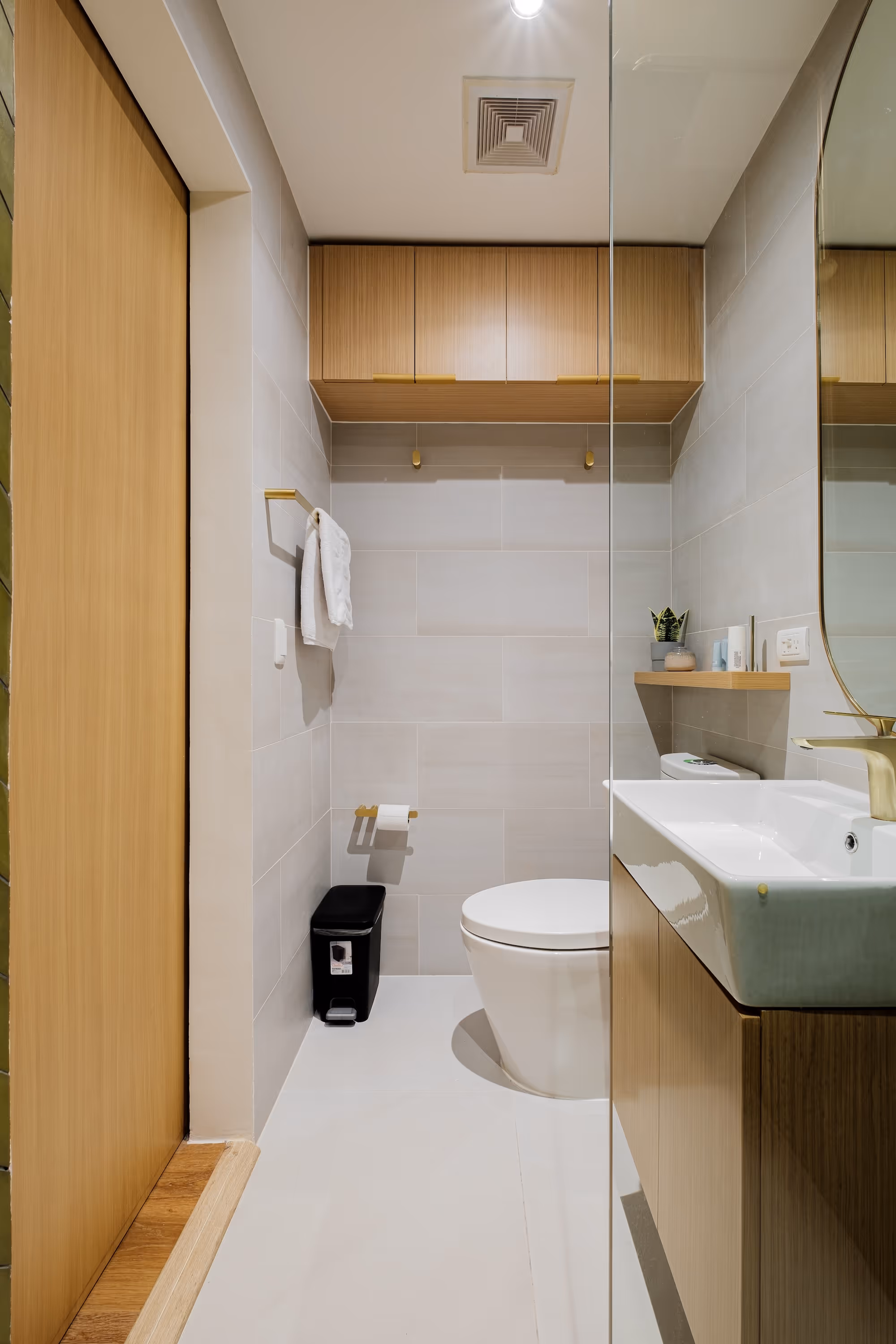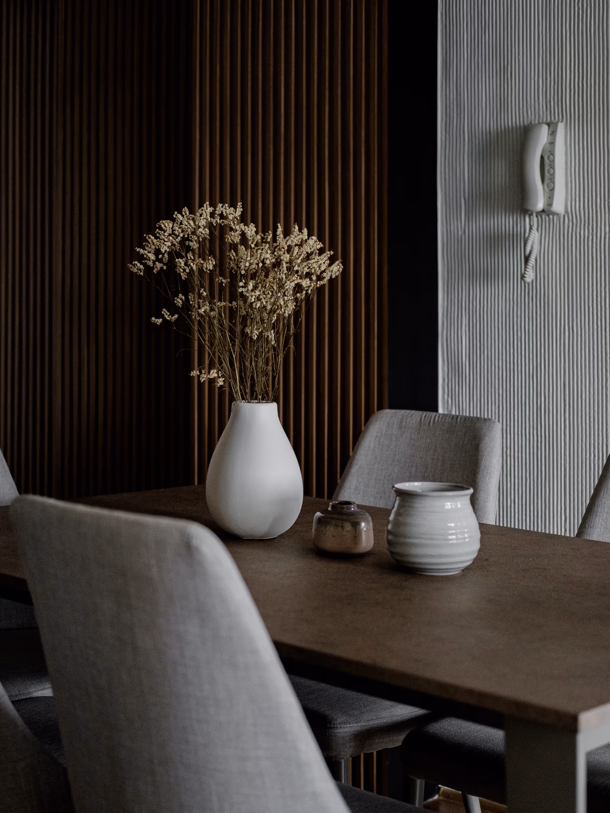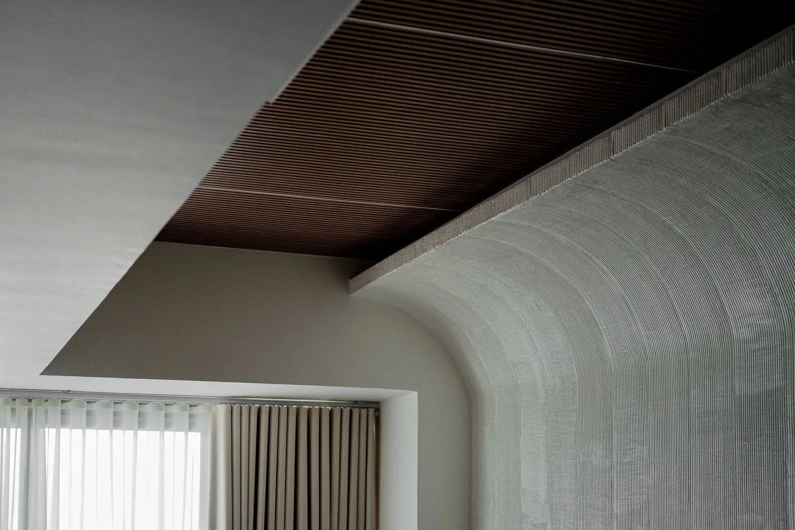 Utilizing the natural light to highlight the subtle textures of stone, wood, concrete and marble; the gentle shadows soften the space to create an open and tranquil atmosphere while maintaining a rhythm of patterns. To expand the sense of space within the narrow floorplan, subtle grooves resulting in a raked finish run horizontally along the walls eventually ending in a gentle curve that draws the eyes upwards to the wooden ceiling to create a sharp contrast.
